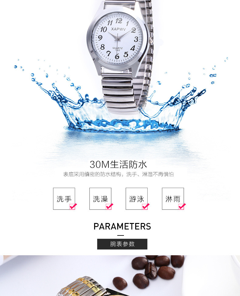 贸点工厂直营MD-1953中老年人大表盘指针数字面男士手表女松紧弹力带石英情侣时尚对表 Trade Point factory direct MD-1953 middle-aged and elderly people dial hands digital face men's watch women elastic elastic band quartz couple fashion pair watch Product size and weight: Weight (g) 60 commodity propert Brand XAPWV/ Charon Whether to import No model MD-1953 Printing LOGO can be customized no special function decoration Display type pointer suitable for crowd lovers style fashion No patent source No waterproof can not movement type quartz Movement brand Domestic movement origin China movement model 68 Thickness 8cm dial diameter 38mm Crown Type Spiral crown Table bottom type Ordinary mirror material Plexiglass mirror Buckle style No buckle Buckle Material Stainless steel strap material Stainless steel Dial shape circular case material alloy origin (domestic) Zhejiang Province Package Specification opp Item No. MD-lt008 After-sales service shop warranty The main downstream platforms are ebay, Amazon,wish, AliExpress, Independent Station,LAZADA Color Gold for men, gold for women, gold for men, gold for women, silver for men, silver for women The main sales areas are Africa, Europe, South America, Southeast Asia, North America, Northeast Asia, Middle East There is an authorized private brand is whether the cross-border export exclusively for the source of goods is Year/Season 2021 Spring 贸点工厂直营MD-1953中老年人大表盘指针数字面男士手表女松紧弹力带石英情侣时尚对表 Trade Point factory direct MD-1953 middle-aged and elderly people dial hands digital face men's watch women elastic elastic band quartz couple fashion pair watch